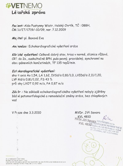 03. 03. 2011 Aldo Pustynny Wiatr, absolvoval echokardiologické vyšetření srdce na přítomnost dědičných vad. Verdikt od pana kardiochirurga: Bez patologického nálezu.